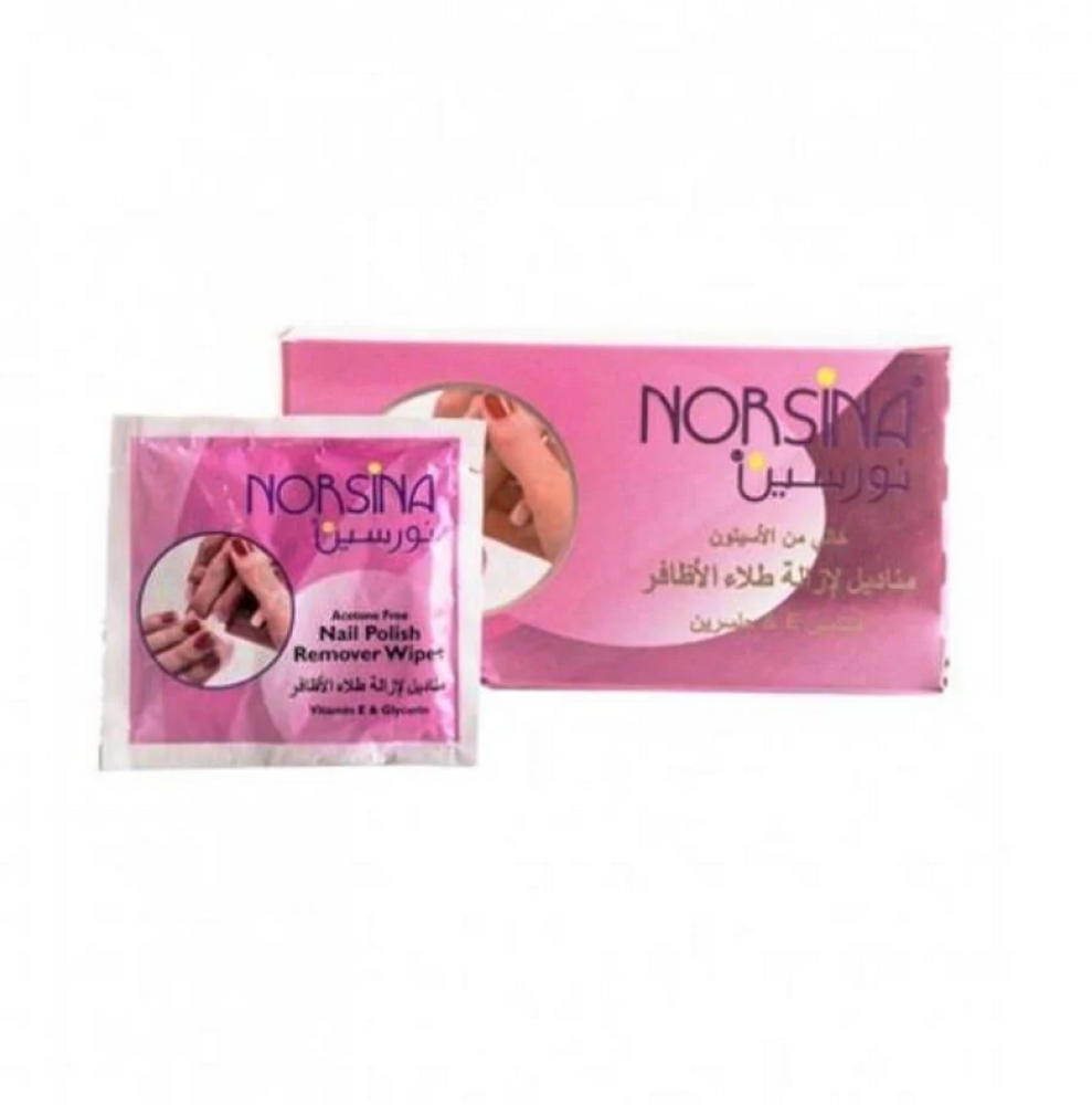 مناديل نورسينا مزيل طلاء-الأظافر . يزيل المناكير من أول مسحة , يحتوي على فيتامين إي و الجلسرين لكي يحافظ على الأظافر من الجفاف .