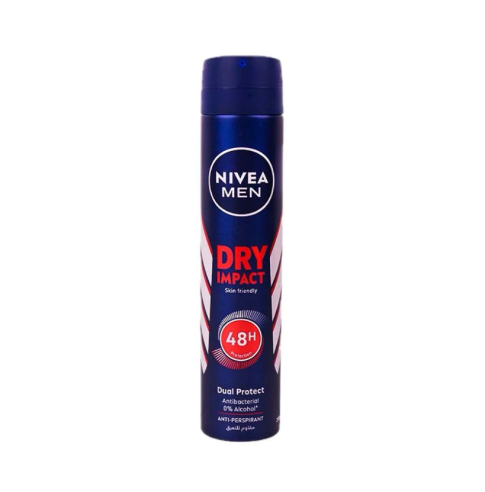 مزيل عرق بخاخ دراي إمباكت من نيفيا بتركيبه فعالة ومزدوجة بمادتين فعالة مقاومة للتعرق لشعور بالجفاف يدوم طويلا ليجعل بشرتك تحت الزراعين ناعمه وحماية أطول من التعرق لبشرتك تدوم ل 48 ساعة. بخاخ مزيل العرق دراي إمباكت للرجال من نيفيا لشعور مليء بالانتعاش دون بقايا بيضاء أو لزجة، كما أنه لطيف على البشرة وخالٍ من الكحول. تركيبة المفعول المزدوج في نيفيا دراي إمباكت للجفاف والانتعاش.